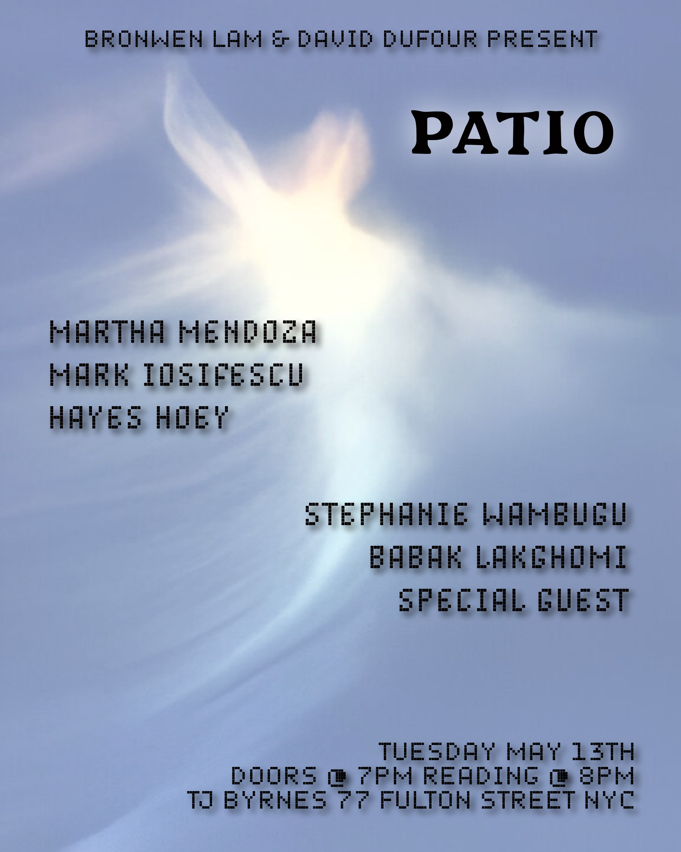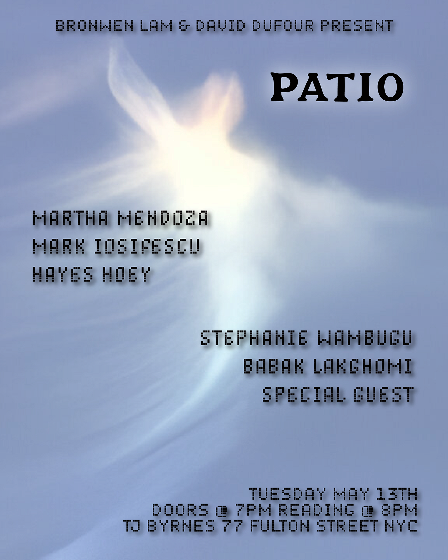 First! A little housekeeping: if you’re in NYC, maybe you want to come to T.J. Byrne’s next Tuesday, 5/13, where I’ll be reading fiction as part of the lineup of Patio, the monthly series programmed by Bronwen Lam and David Dufour. Doors at 7:00, readings at 8:00, a thoroughly no muss/no fuss type arrangement.