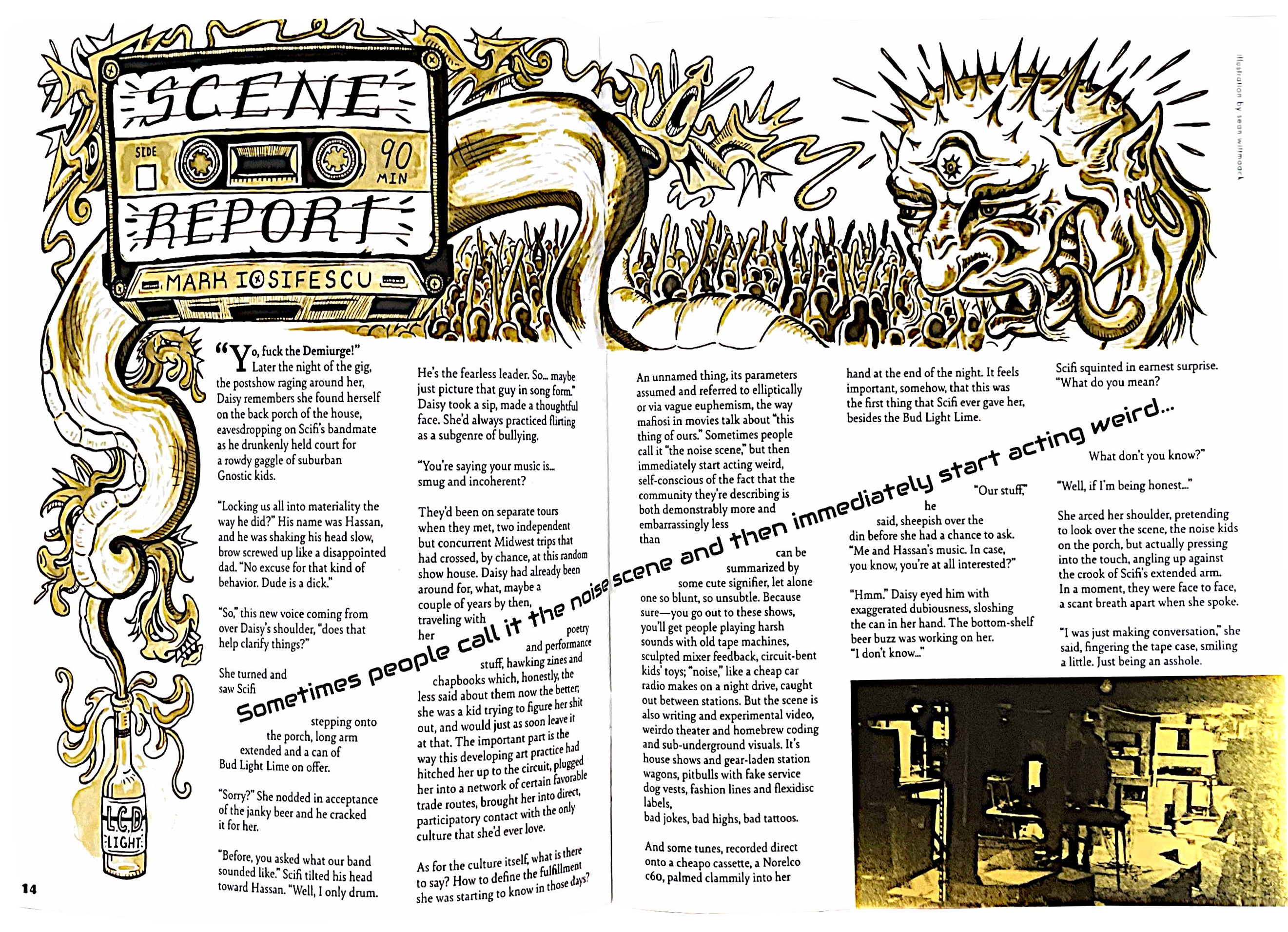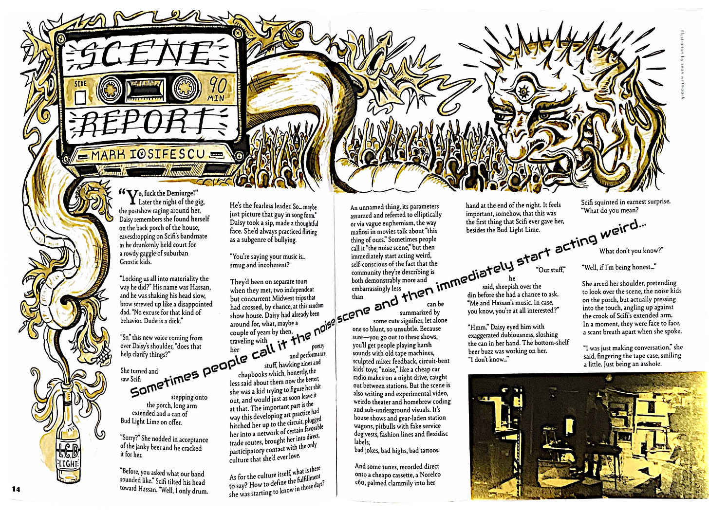 Anyways, maybe goes some way toward accounting for why I’m so psyched to have been included in this mag; this place has meant the world to me (which is also why you should donate). Meanwhile my LCD piece, “Scene Report,” is reproduced below (in its print layout, which I didn’t make but am into, since I’ll never be bummed to pick up a zine and see crazy drawings and, like, snake creatures). The text is loosely excerpted from a way lengthier novel manuscript, and concerns a group of kids in the experimental arts community getting into all kinds of convoluted relationship dramas while also reaching the exhausted endpoints of their DIYer idealisms. This excerpt features an opening quote stolen from something our long-ago buddy Ryan (from the Western Mass freakout band Astral Plane Junkies) laid on us when we told him we were studying Gnosticism. Just a really good quote IMO.